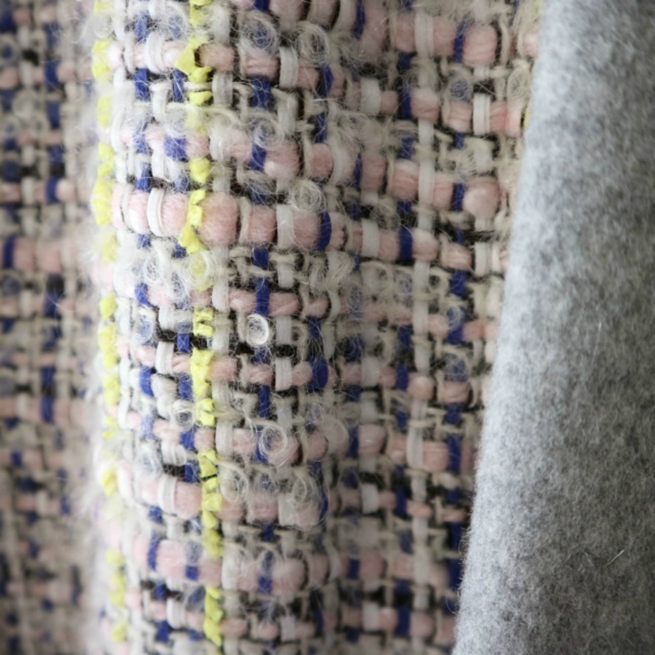 くるくるカーリーな毛足がかわいいループ糸や、原毛のような糸、和紙のような糸など、いろいろ糸を織り交ぜたオリジナルのツィードコートです。