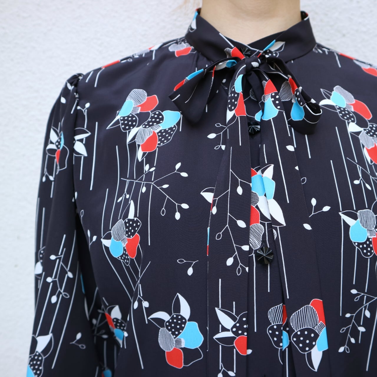 ツバキ柄ギャザー袖ブラウス・ブラック