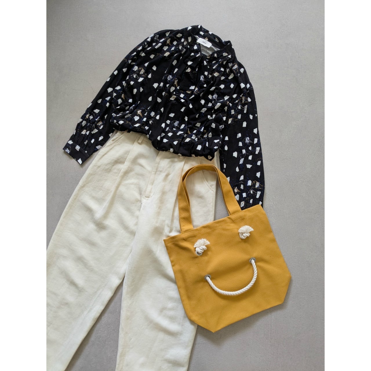 ロープハンドルのシンプルなバッグから、大きなスマイルフェイスが飛び出す2WAY仕様のトートです。
