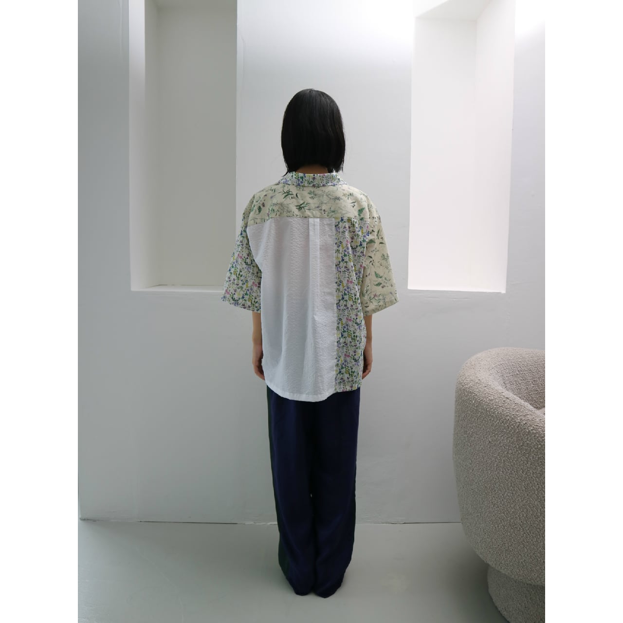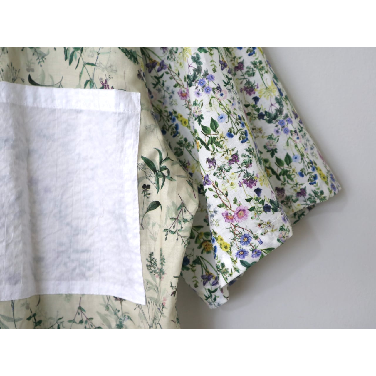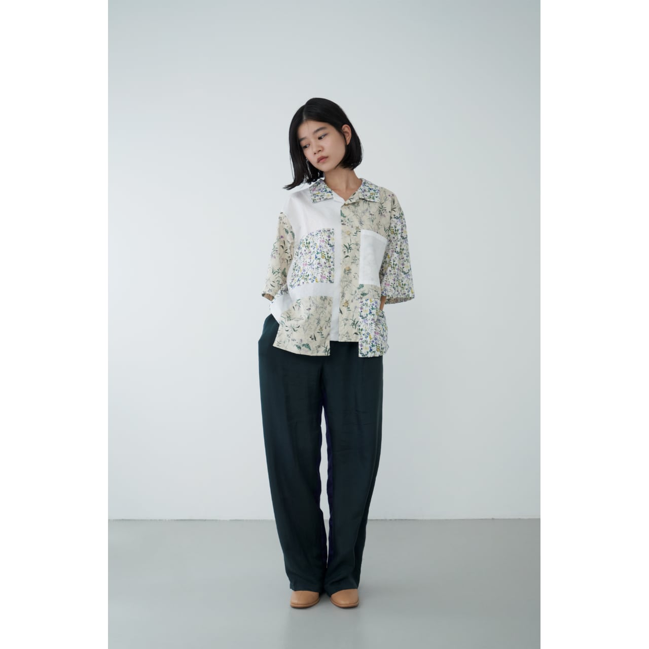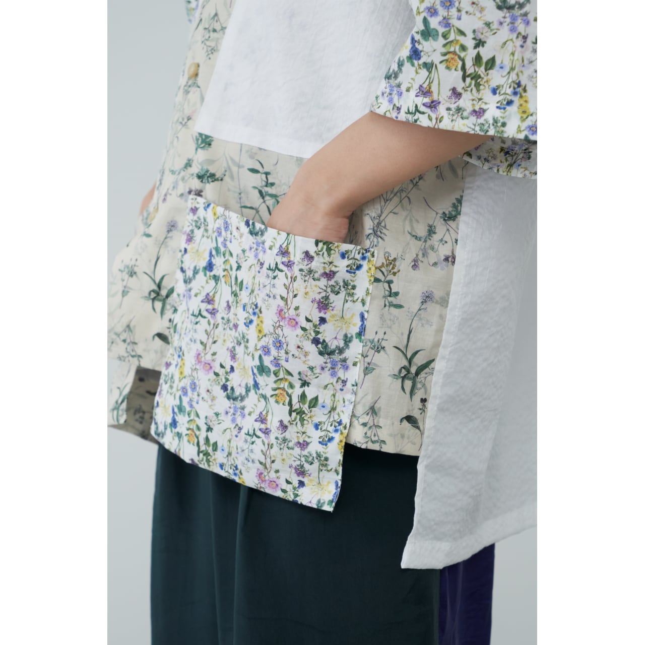 色味の異なる2種類の花柄と、シボのあるコットンボイルを組み合わせたショート丈の開襟シャツです。 身頃に収まりきってないポケットがポイントです。 下に長袖のカットソーを合わせた重ね着もかわいいと思います◎ ●混率 コットン100% ●size(cm) 身丈52.5(前) 身幅58 肩幅46 袖丈27.5 *モデル身長154cm