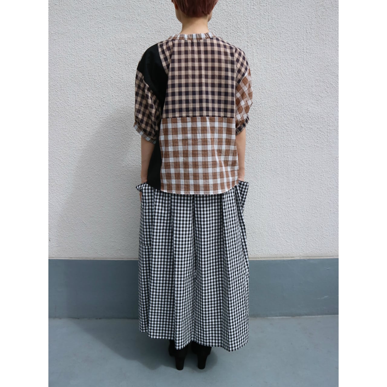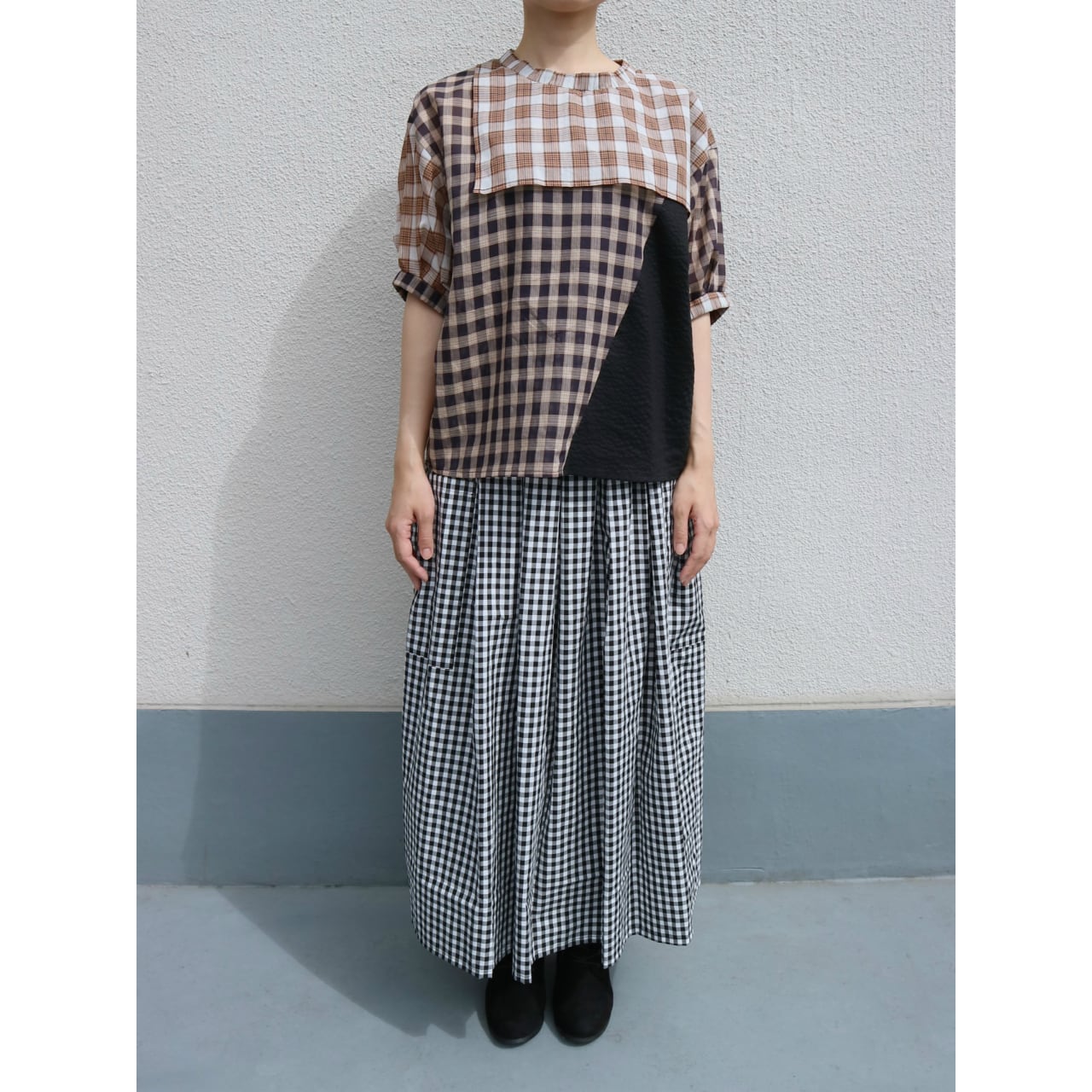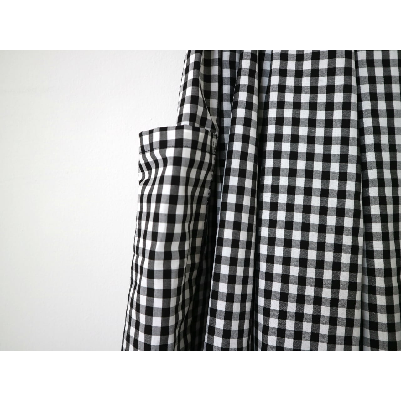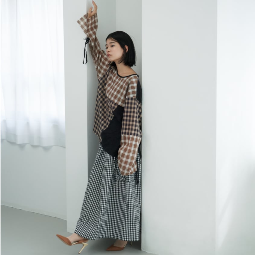両サイドに大きなパッチポケットのついた、ギンガムチェックのシンプルなギャザースカートです。 プレーンな平織りのコットン素材なので、洗いざらしで気軽に履いてください。 ●混率 コットン100% ●size(cm) Free:ウエスト65~(ゴム) ベルト巾4 脇丈85 裾周り214 *モデル身長 2枚目154㎝ / 4,5枚目158cm、